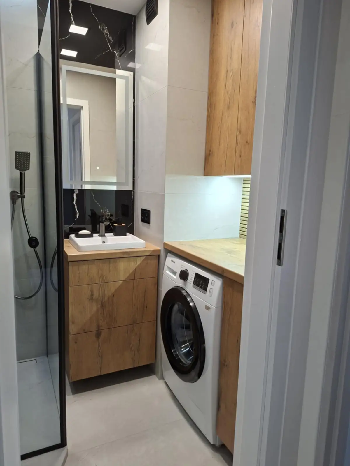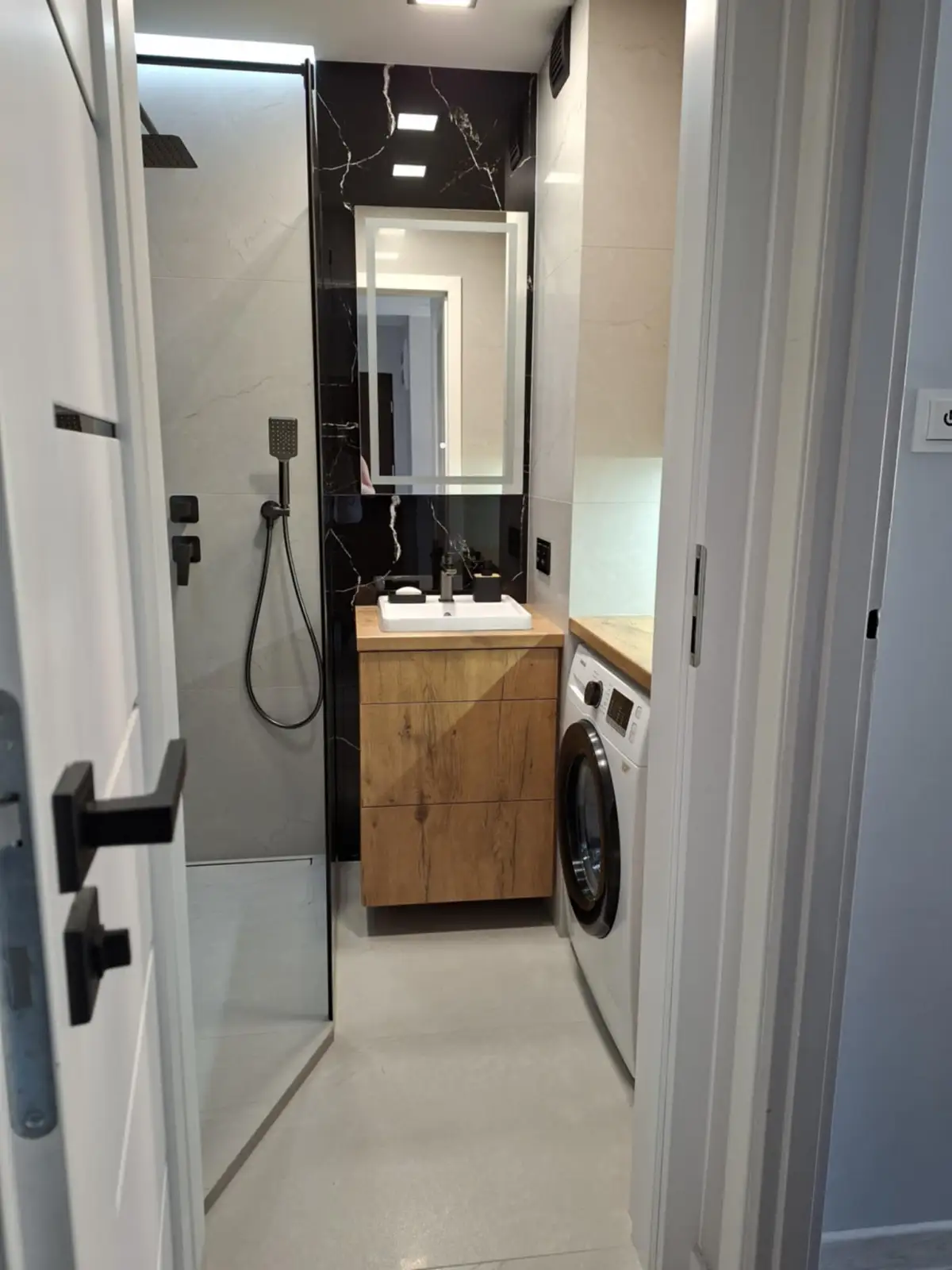 Kompleksowy remont łazienki w nowoczesnym stylu loft. Kabina prysznicowa walk-in z czarnym profilem, szafka podumywalkow...