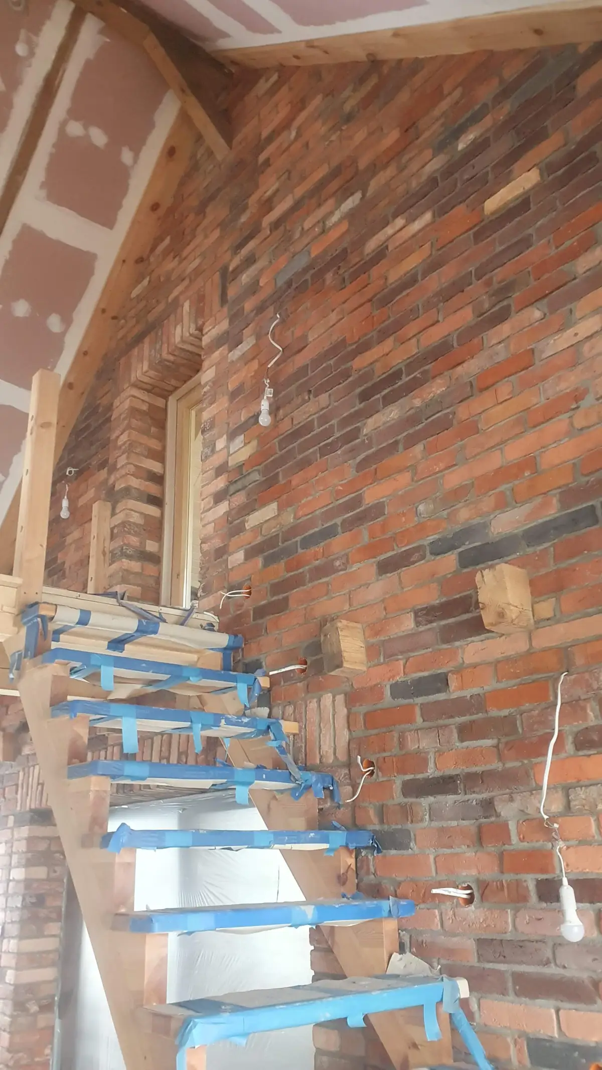 Efektowna adaptacja starego budynku gospodarczego z cegłą i drewnianymi schodami. Oryginalna cegła oczyszczona i zabezpi...