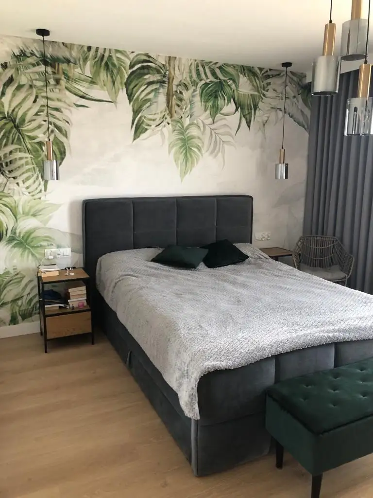 Kompleksowe wykończenie pod klucz przestronnego apartamentu. Salon z designerskimi lampami wiszącymi i meblami tapicerow...