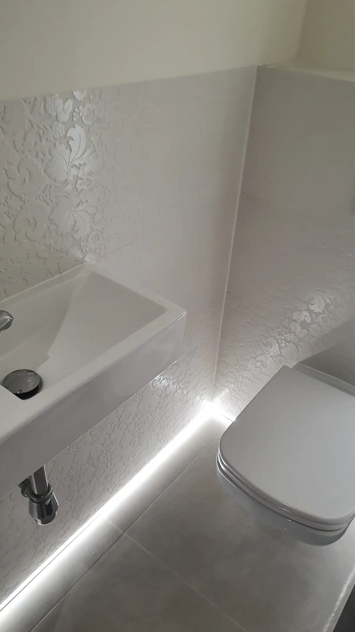 Łazienka wykończona płytkami z delikatnym ornamentem roślinnym w odcieniach bieli i szarości. Podświetlenie LED pod półk...
